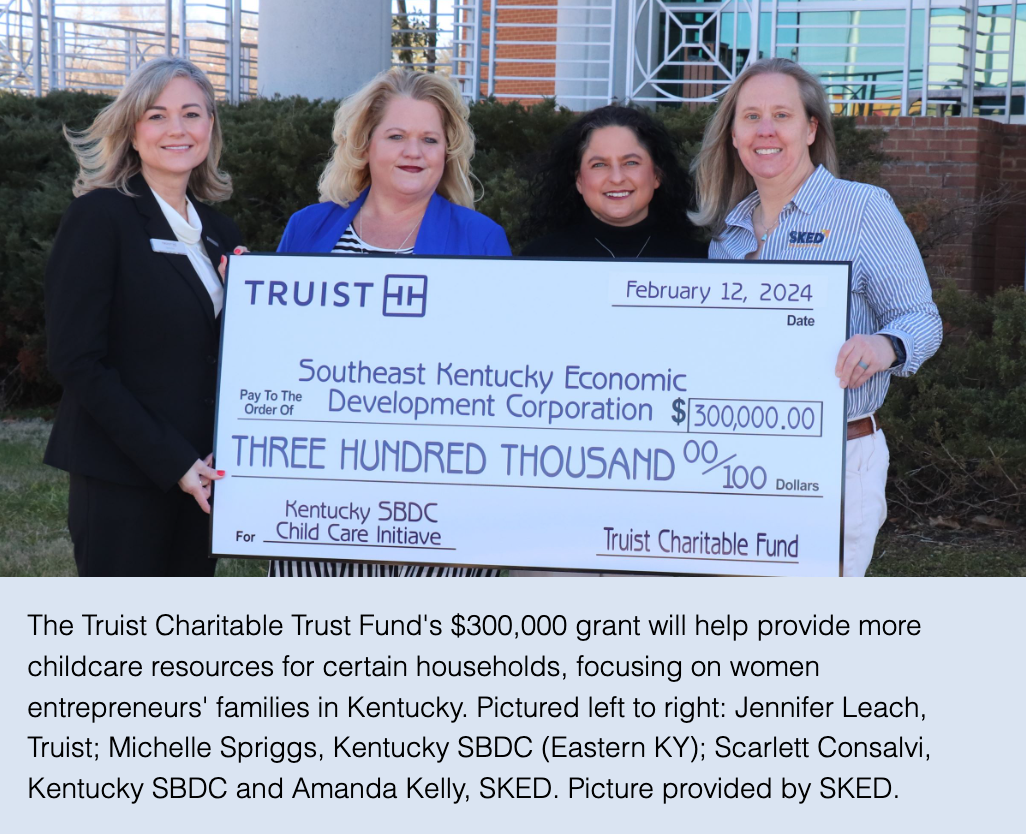 A grant for the Kentucky Small Business Development Center (SBDC), in partnership with the Southeast Kentucky Economic Development Corporation (SKED), will help advance childcare resources for moderate-income households and women entrepreneurs' families in Kentucky.
