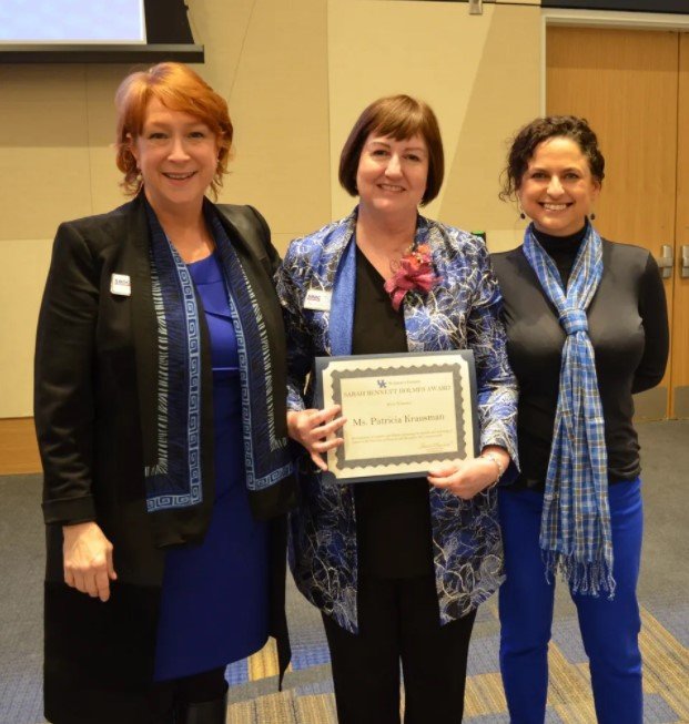 March 27, 2019, Patricia Krausman was honored as a Sarah Bennett Holmes Award nominee. Krausman was recognized for her significant contribution to the economic vitality in the rural Kentucky communities she serves and her work in establishing and coordinating statewide initiatives, including programs for agricultural diversification, women, and veterans. Krausman's service on boards such as the KY Commission on Small Business Advocacy and the Lincoln Trail Workforce Development Board emphasized her commitment to bettering her community.